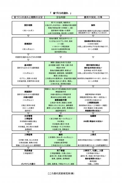 設計費用 設計業務は、敷地を調査して平面プランを決めてゆく「提案設計」。決まった平面プランに基づいて具体的な仕様や構法を決め、基本図面を作成する「基本設計」。工事に必要な図面を作成してゆく「実施設計」。木材の設計や検査等をする「木組み設計」。そして、工事が適切に行われるか監理をする「工事監理」。の5つのカテゴリに分かれます。原則としてこの5つを一貫して行うことを当社の設計業務としております。 |